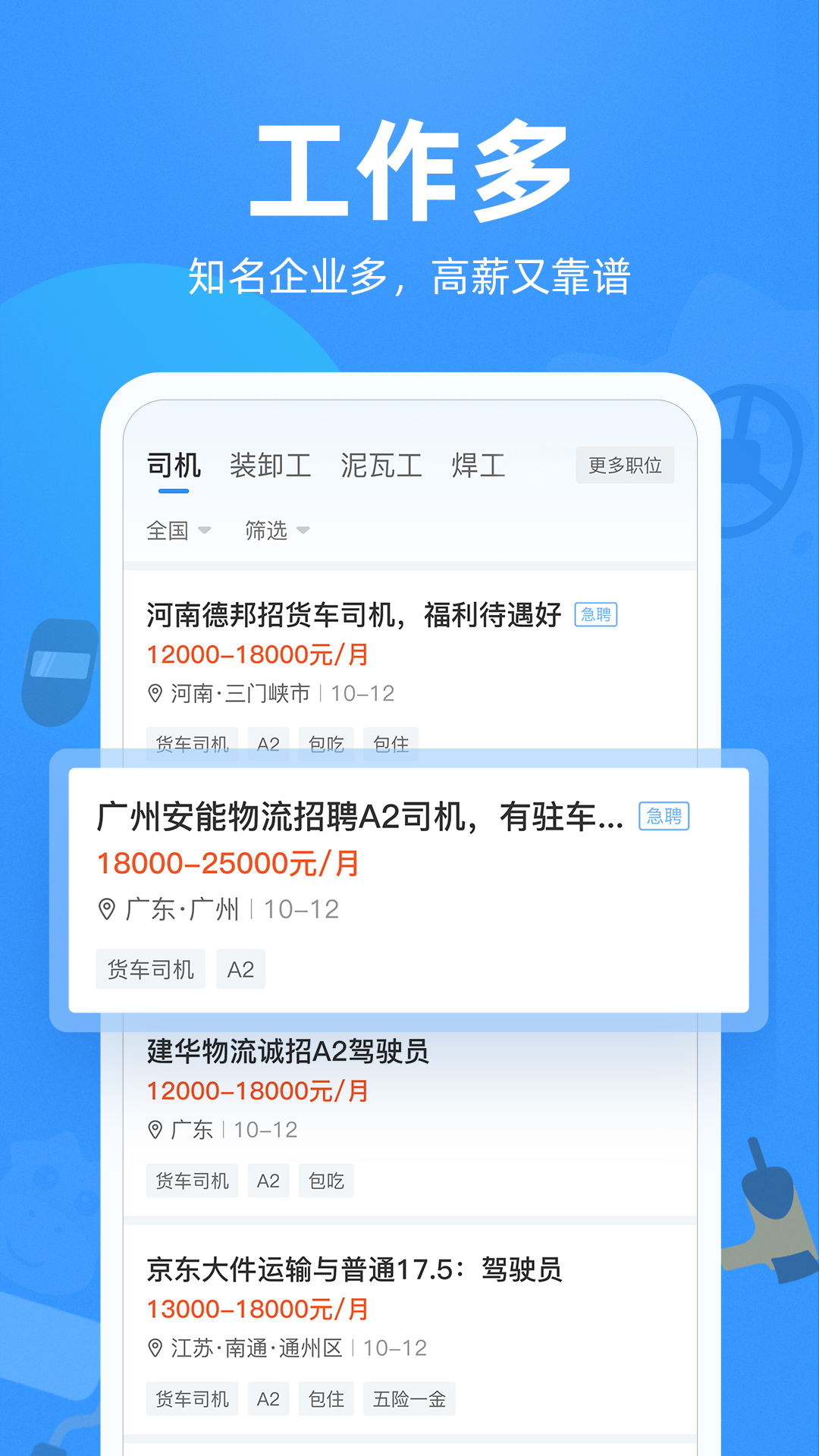 用户可在求职者与雇主身份间自由切换。求职者可通过选择地址、筛选驾驶车辆类型或工种快速找到匹配岗位;雇主则可通过城市筛选、薪资范围、工作经验等条件定向招募人才。